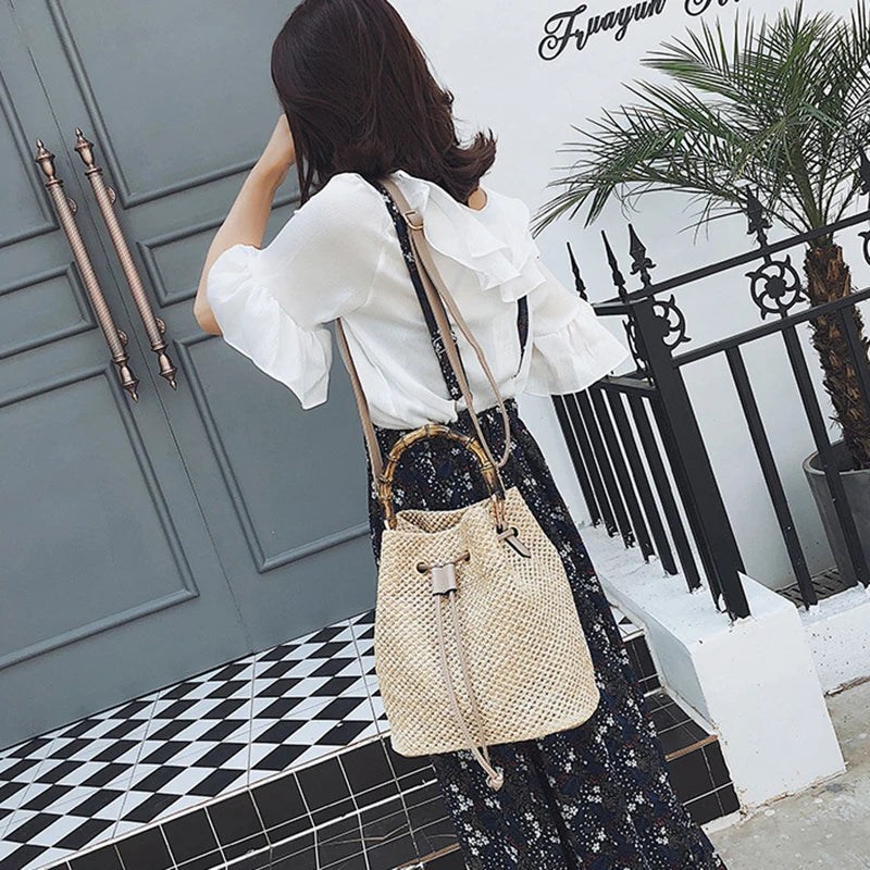 Women's Straw Bucket Bag Woven Shoulder Beach Handbag