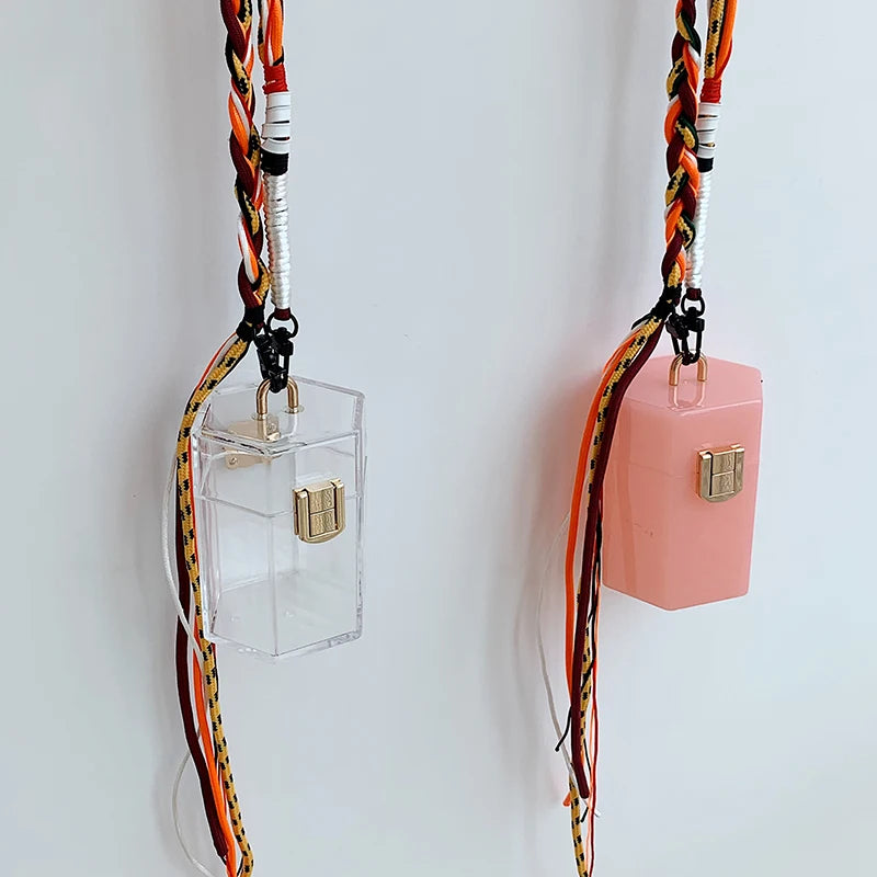 Elevate your style with this acrylic mini party clutch featuring a woven shoulder strap. Perfect for women who want a chic and trendy accessory.
