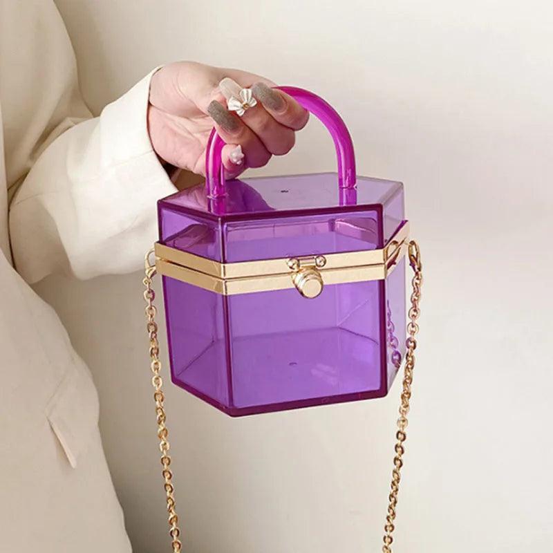 This stylish acrylic bag features a transparent box chain design, perfect for carrying essentials. The single shoulder strap makes it easy to carry around.