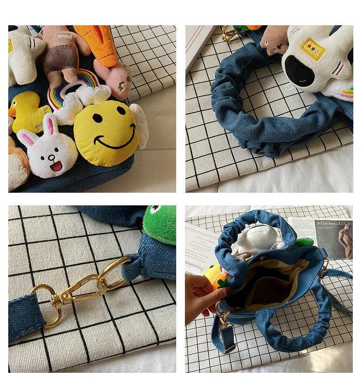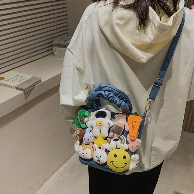 Stay stylish with this cute cartoon canvas bag featuring an autumn girl design and a rabbit plush pendant. Perfect for carrying your essentials.