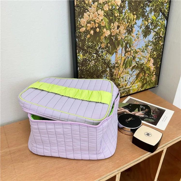 High-capacity portable cosmetic bag for women made of durable nylon. Ideal for organizing and storing toiletries or makeup.