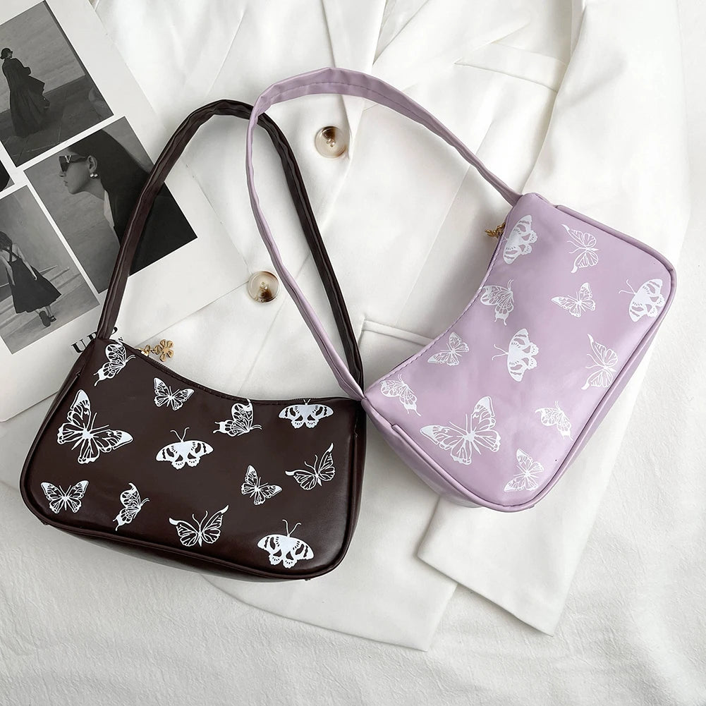 This stylish shoulder bag features a beautiful butterfly print on PU leather. Perfect for spring and summer, it is a practical tote with a zipper closure and a half-moon shape.