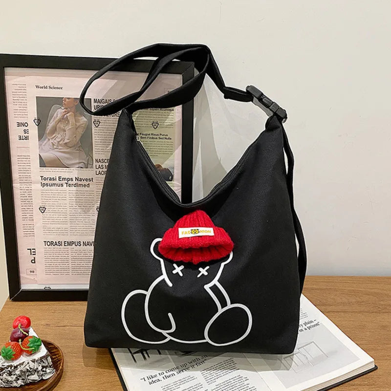 This canvas tote bag is designed for women and features a large capacity for shopping. It can be used as a single shoulder bag or messenger bag. The cute cartoon design adds a fun touch to your style.
