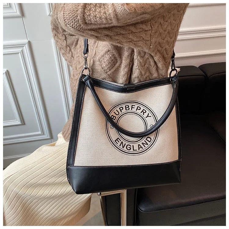This large portable shoulder bag is perfect for women looking for a versatile and stylish accessory. Made of durable canvas, it features a casual letter design that adds a trendy touch to any outfit. Ideal for shopping and everyday use.