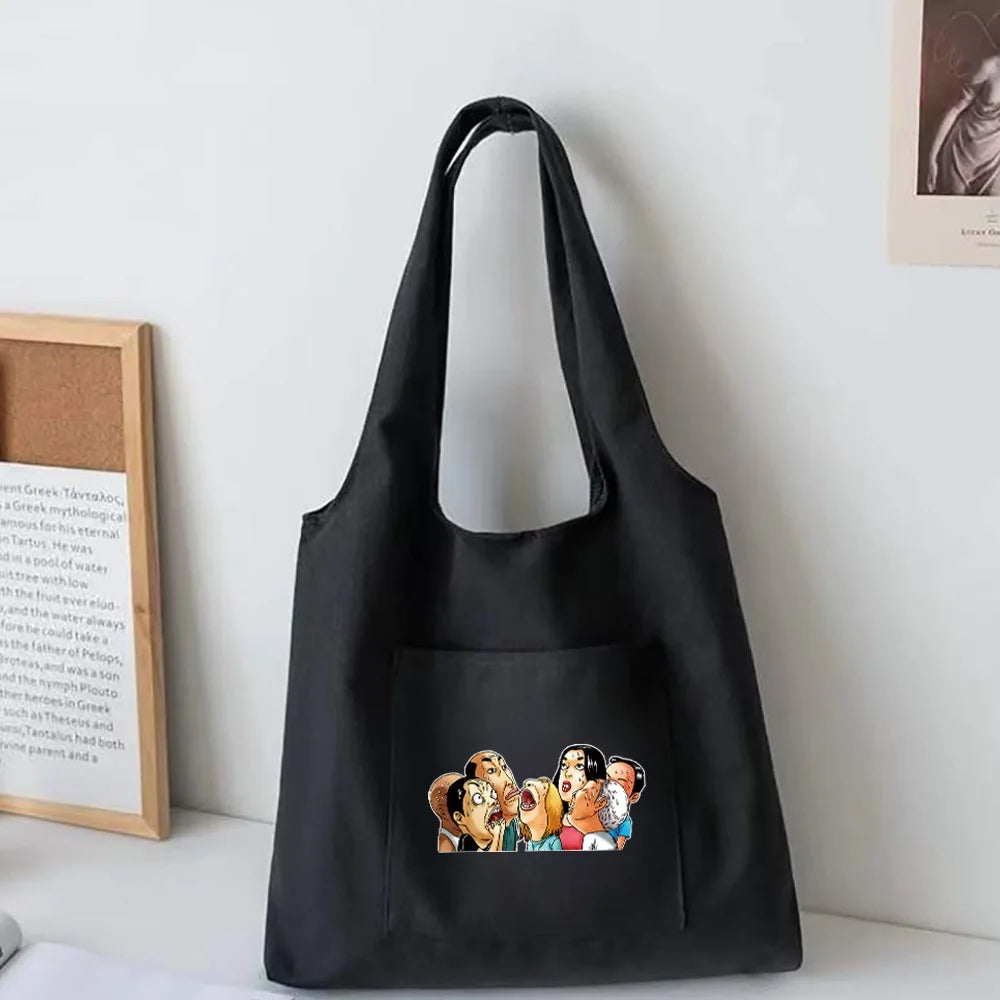 This canvas tote bag features a cute cartoon printing design, perfect for travel and everyday use. It can be worn as a shoulder or crossbody bag.