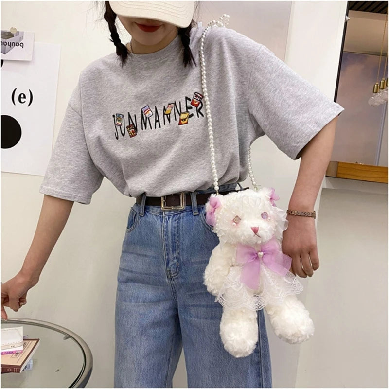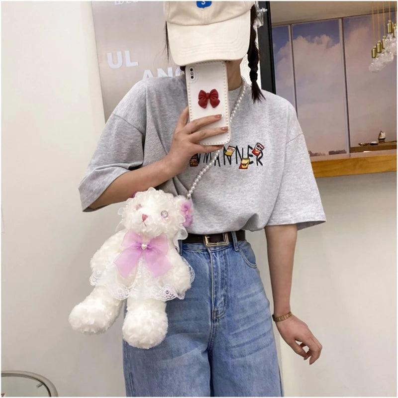 This adorable shoulder bag features a cartoon bear design with a bowknot, perfect for girls and women. It is ideal for travel and everyday use, adding a touch of Harajuku style to your outfit.