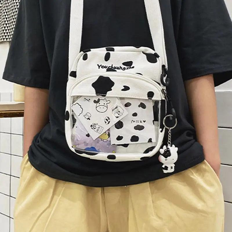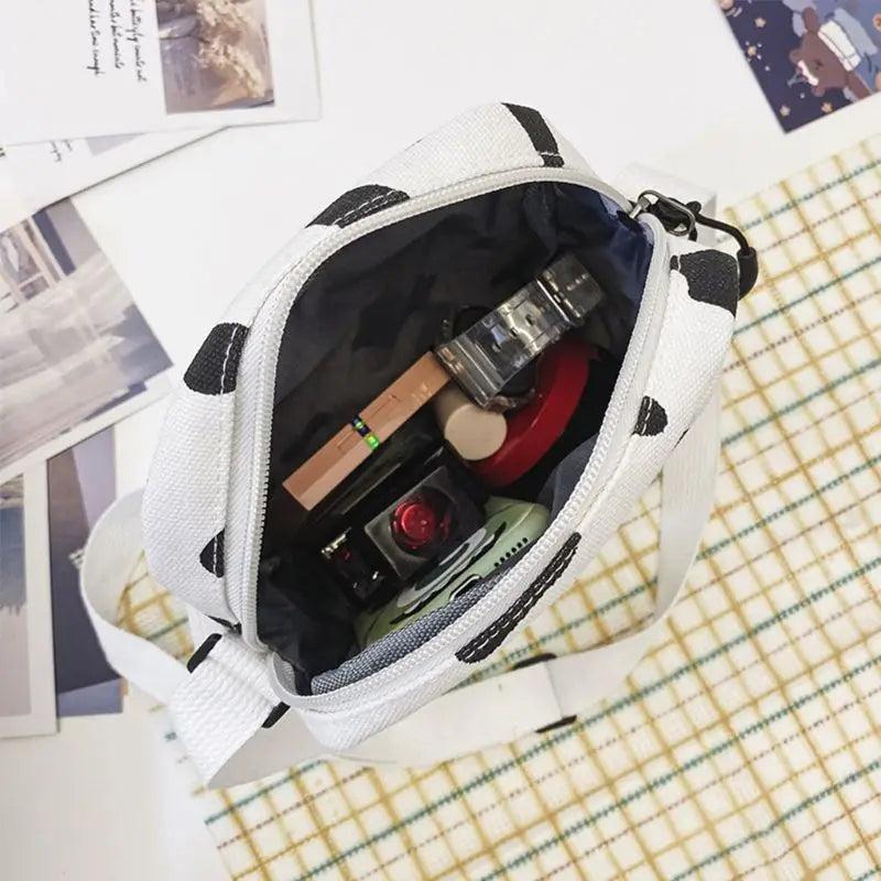This cute cow print shoulder crossbody bag is made of durable canvas material. Perfect for carrying your essentials in a fun and stylish way.