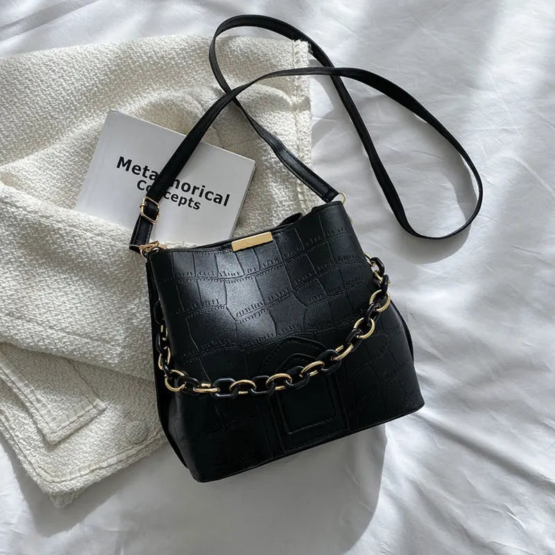 Stay stylish with this high bucket bag made of PU leather. It can be worn as a shoulder bag or crossbody bag, featuring a chain strap for a trendy look.