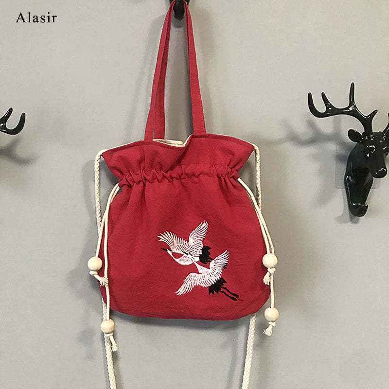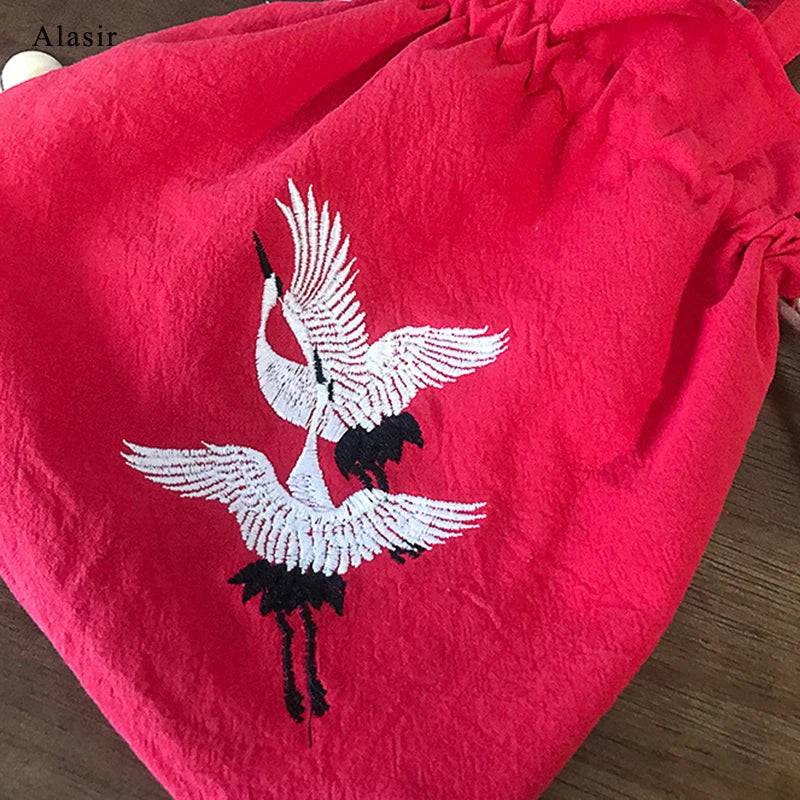 Chinese Style Crane Drawstring Bag Antiquity National Embroidery Bucket