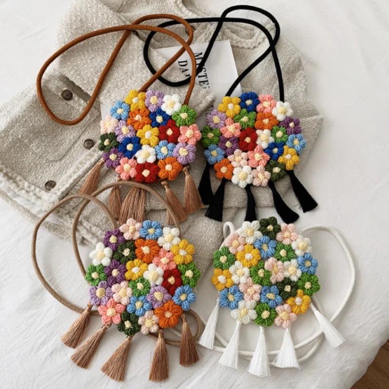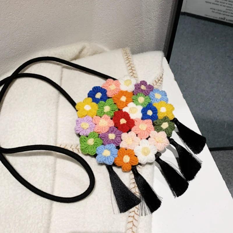 This small woven bag is perfect for beach vacations or casual outings. It features a colorful flower design and is made of high-quality wool. The shoulder strap allows for easy carrying.