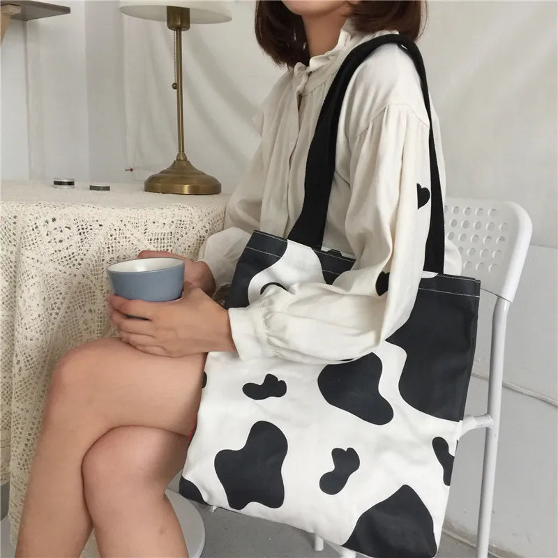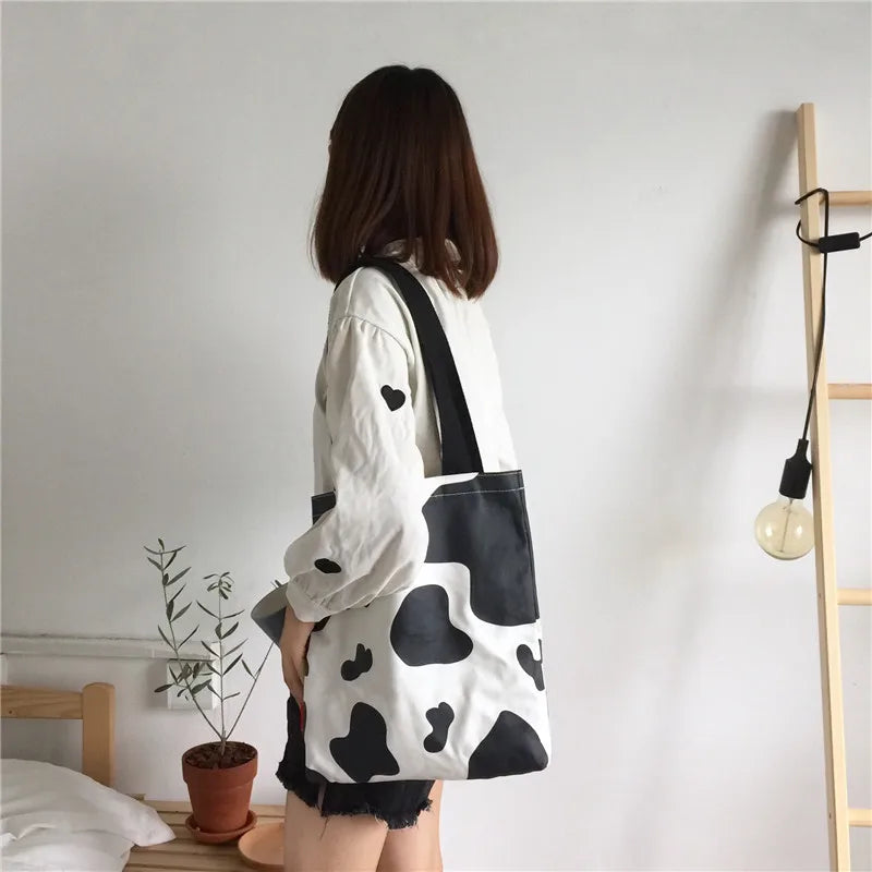This Harajuku style shopping bag features a cute cow pattern, perfect for sweet girls to carry their essentials. It is a casual tote bag that is great for leisure activities.