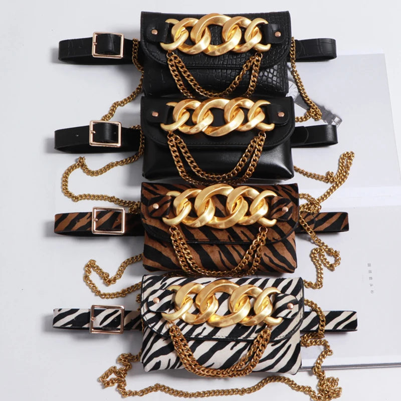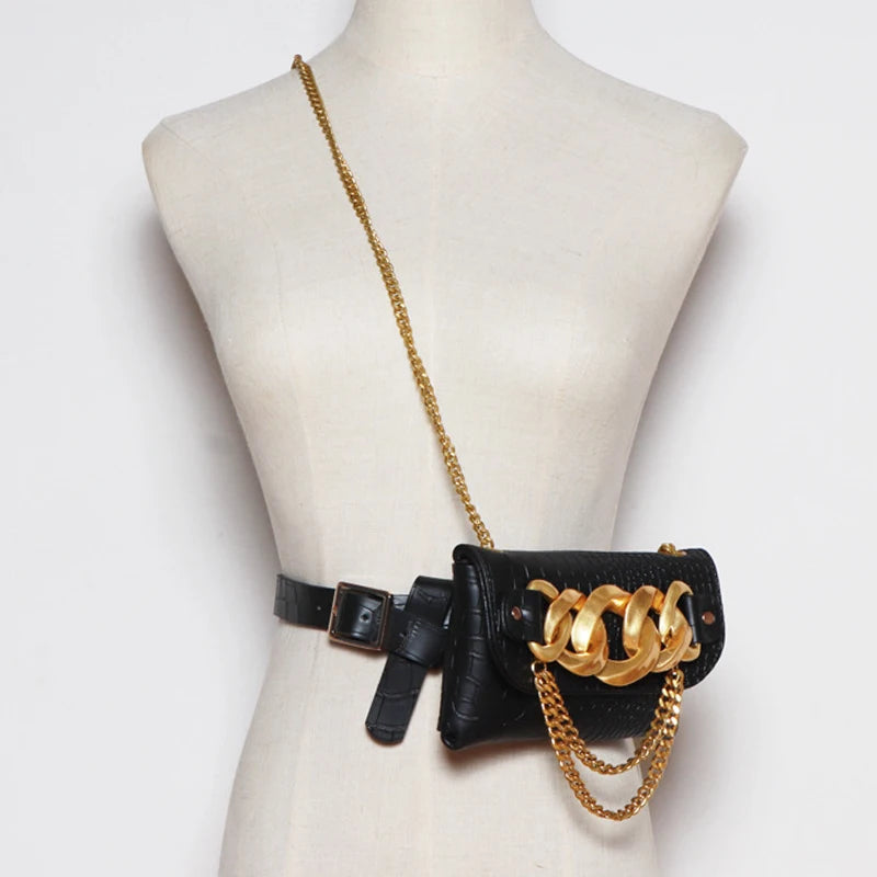 - Can be worn as a fanny pack, chain belt bag, or crossbody bag