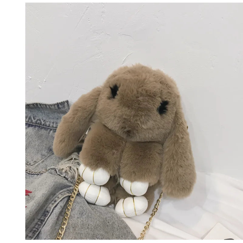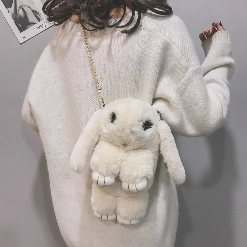 Adorable plush bunny rabbit shoulder bag made of faux fur. Perfect for women who love cute and unique accessories. Ideal for daily use or special occasions.