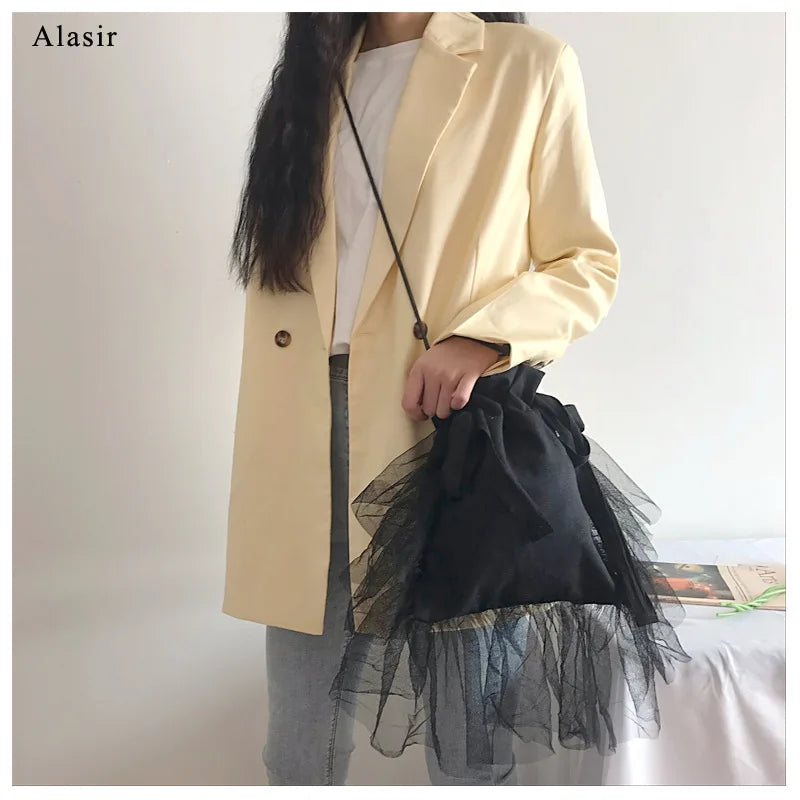 This canvas patchwork bag features a unique dark style with ruffles, perfect for a casual and original look. The drawstring closure adds convenience.