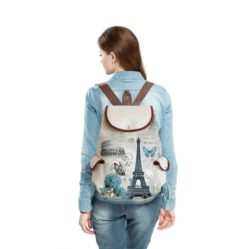 This stylish backpack featuring an Eiffel Tower print is perfect for women who love to travel, go to the beach, or attend school. It offers a large capacity and comfortable design.