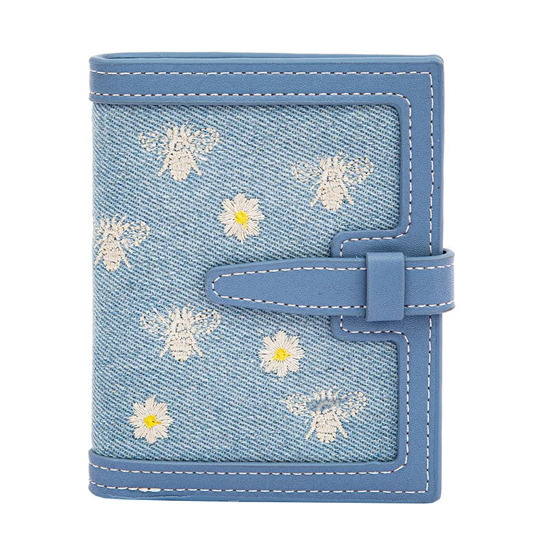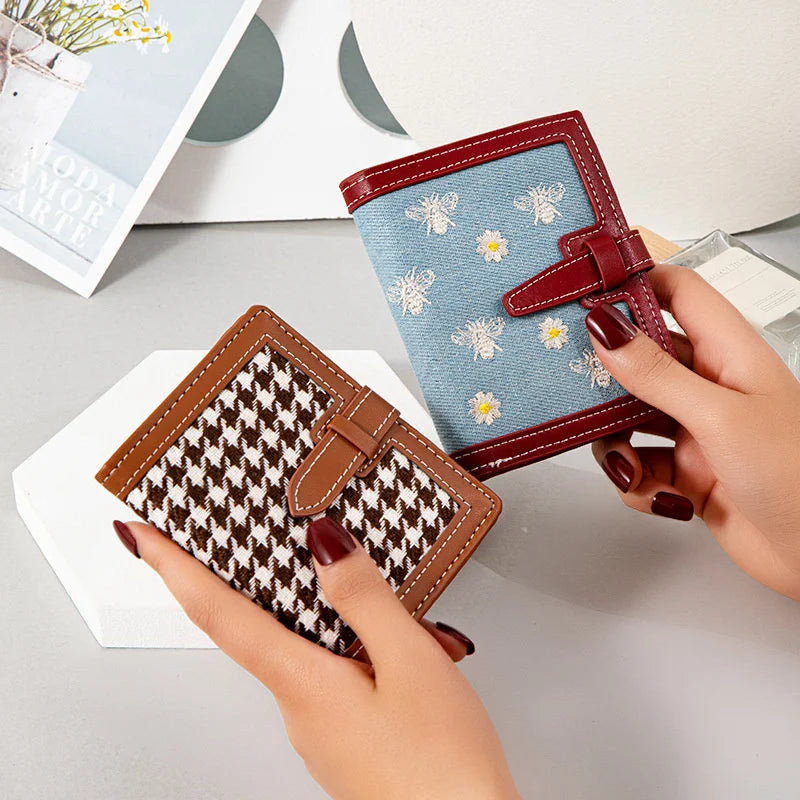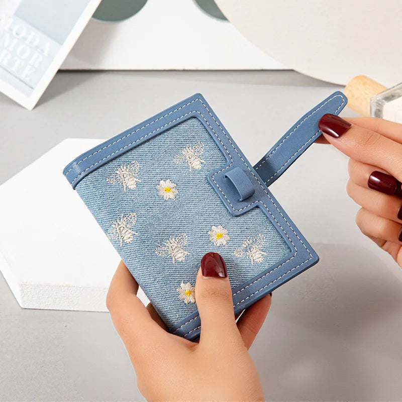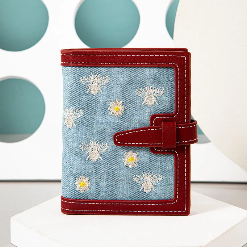 This small fresh wallet features beautiful embroidery and a two-fold design. It has a draw belt closure and multiple card slots, perfect for carrying your essentials.