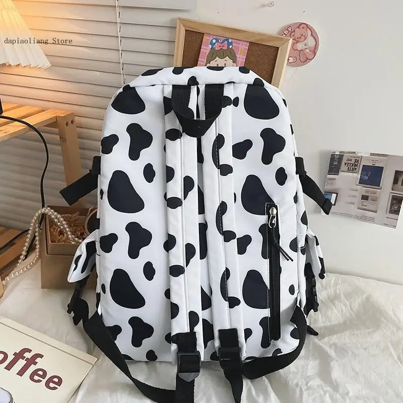 Description:Stay stylish and organized with this trendy cow pattern backpack made of durable nylon material. Perfect for students or daily use.Features: Large capacity design for all your essentials Waterproof material to keep your belongings safe Features a trendy cow pattern for a fashionable look Adjustable shoulder straps for comfortable wear...