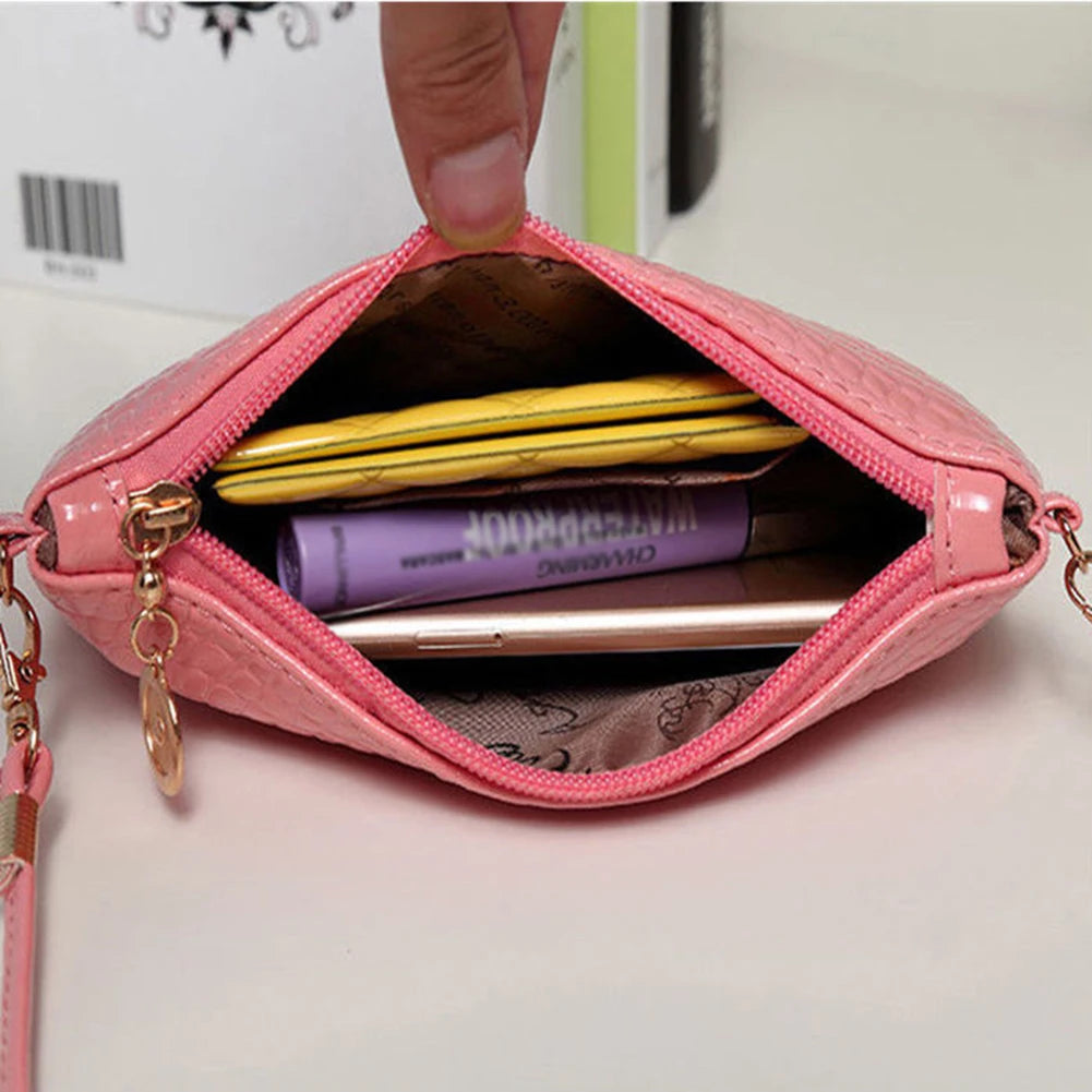This stylish clutch is made of faux leather with a convenient zipper closure. It can be worn as a crossbody or shoulder bag, perfect for carrying your phone and essentials.