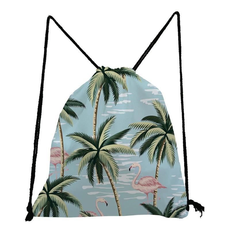 • Foldable drawstring backpack with flamingo and coconut tree design