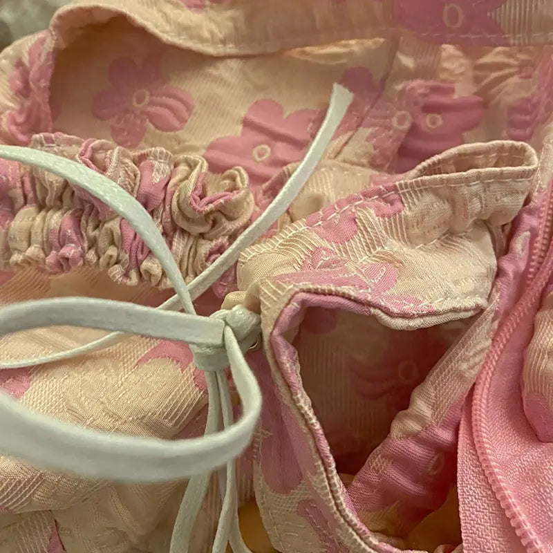This women's shoulder bag features a floral design on canvas with pleated detailing. It has a spacious interior, ideal for students or everyday use.