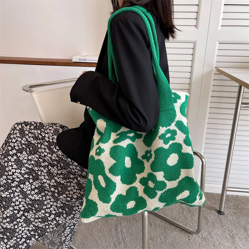 Stay stylish with this contrasting large tote bag. Hand-knitted with a floral design, it is perfect for casual outings and adds a touch of elegance to any outfit.