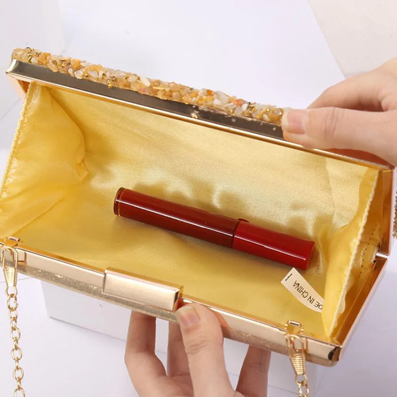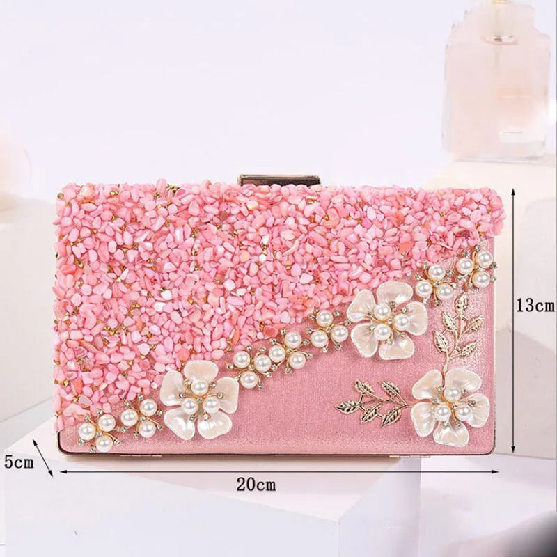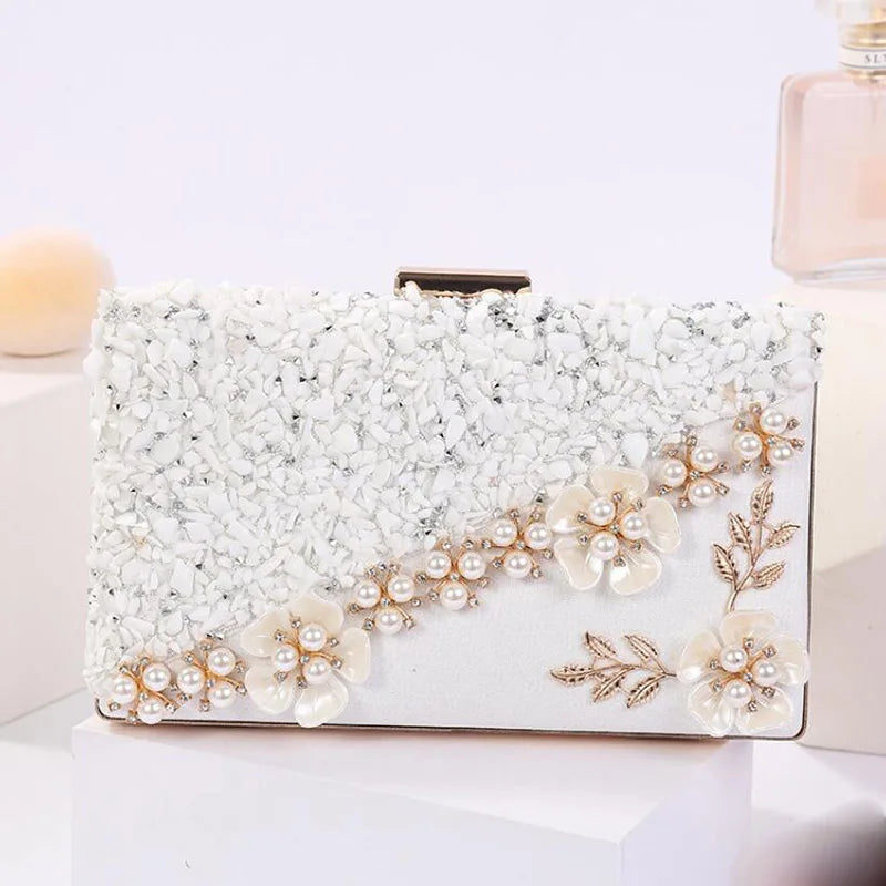 Elegant women's clutch bag adorned with flowers and rhinestone chain, perfect for weddings, parties, and special occasions.