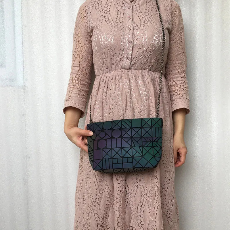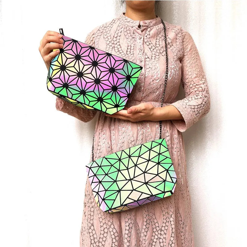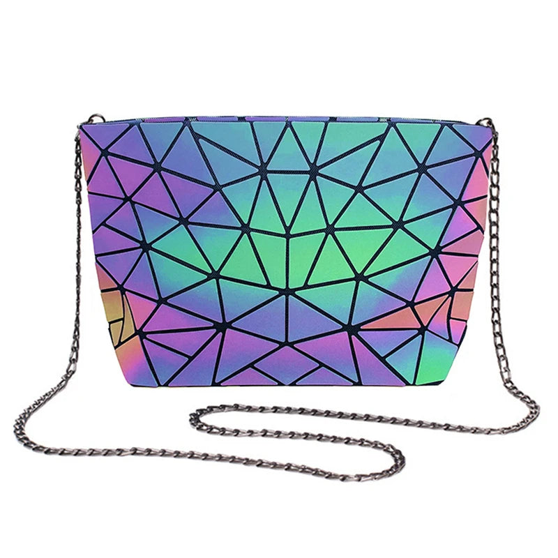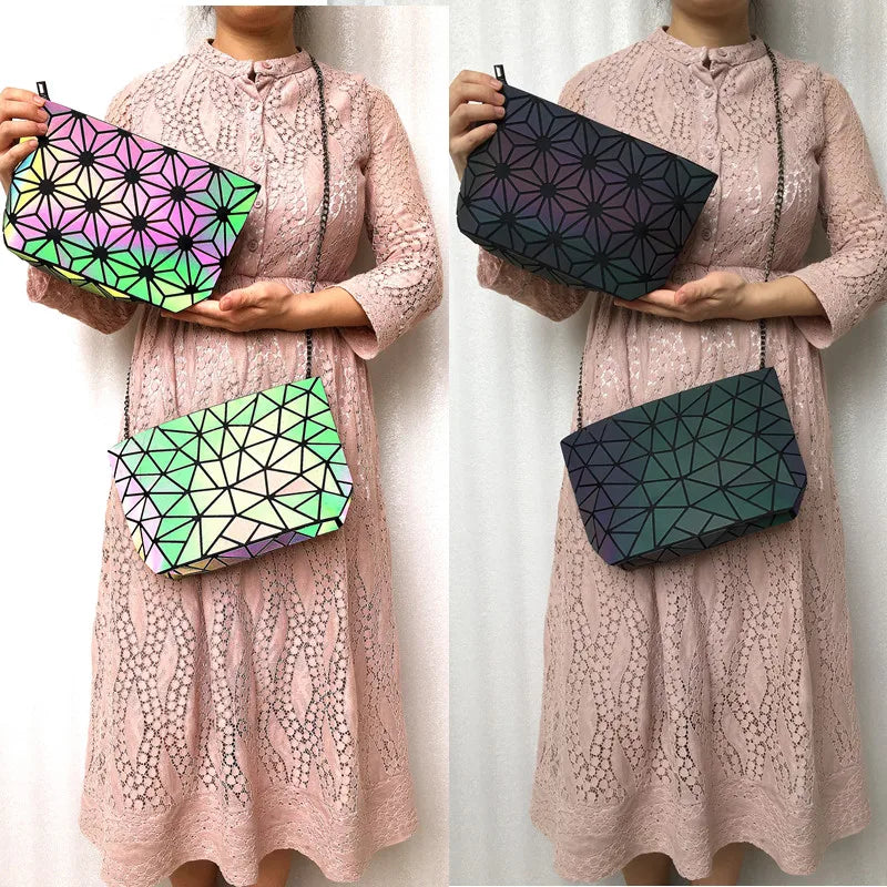 This folding shoulder bag features a unique geometric design with holographic luminous effect, perfect for women who want to stand out. The reflective material adds a stylish touch to any outfit.