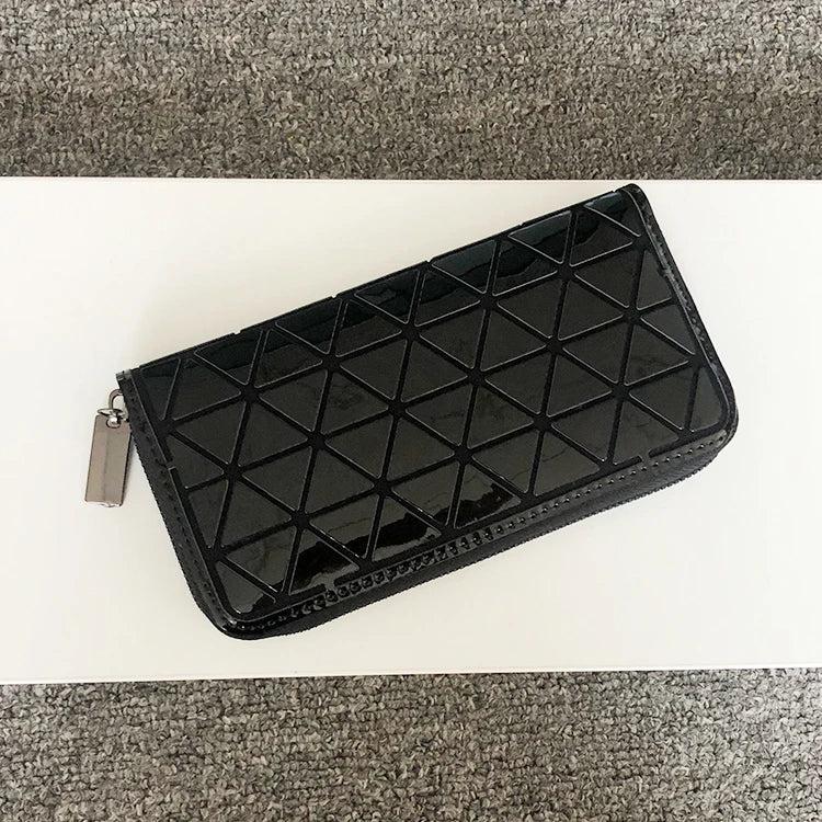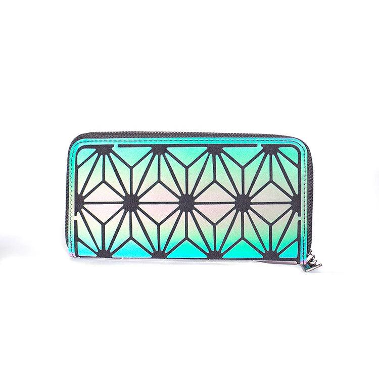 This long geometric wallet is designed for women, featuring a lattice pattern that illuminates in the dark. It's both stylish and functional.