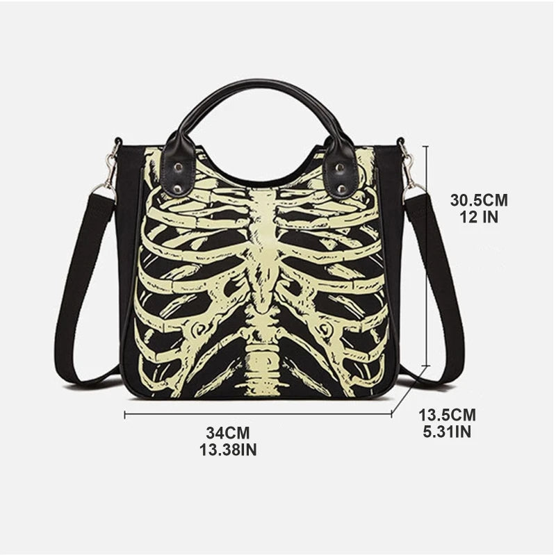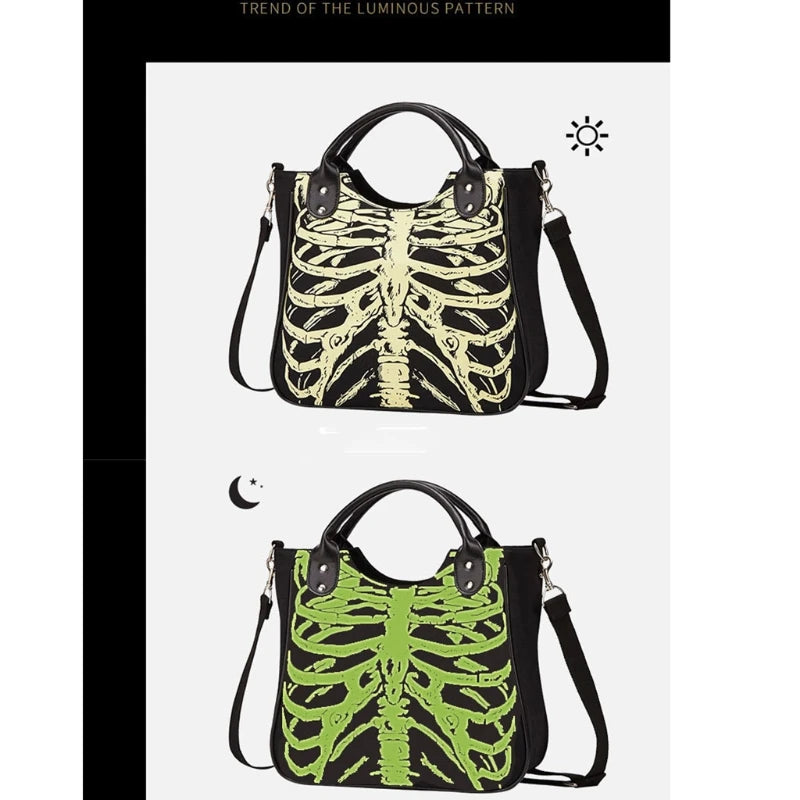Get into the Halloween spirit with this edgy shoulder bag featuring luminous gothic skeleton bones and skulls. Perfect for adding a punk touch to your outfit.