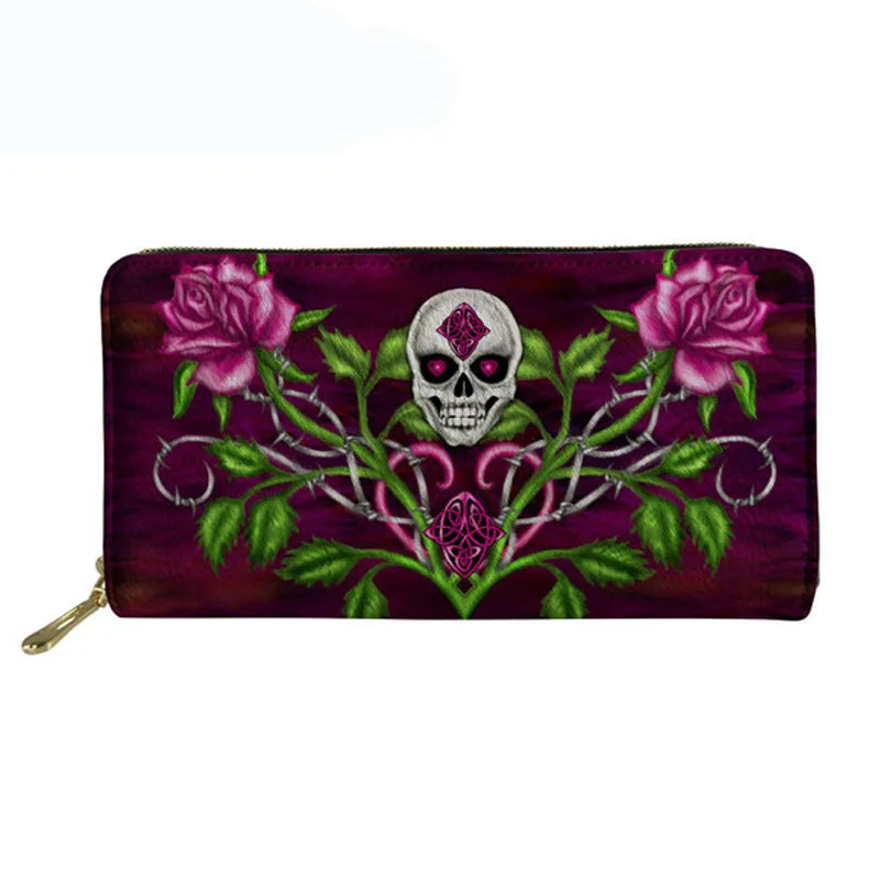 Keep your cash and cards organized in this waterproof leather wallet featuring a stylish gothic skulls print. It also includes a coin purse, phone pocket, and notecase.
