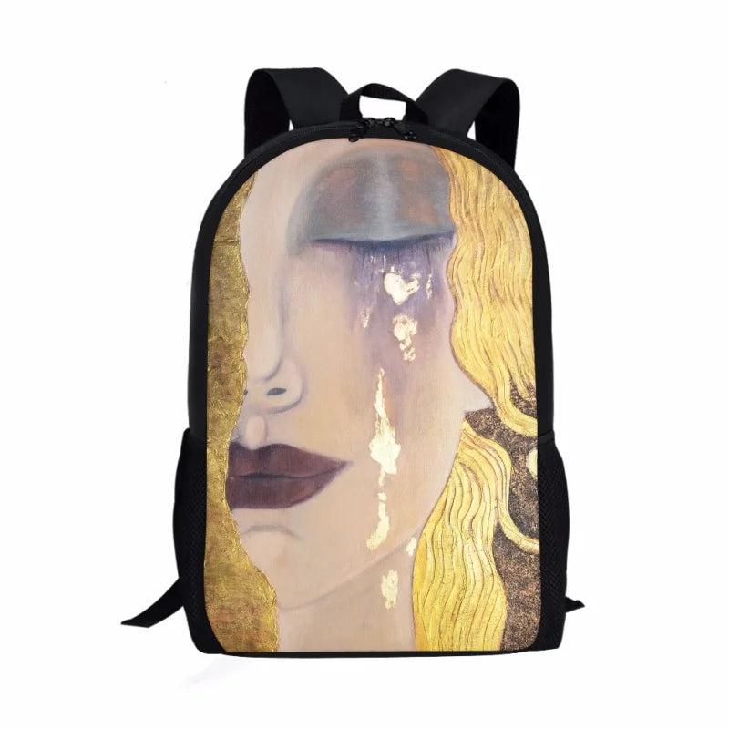 Beautiful Gustav Klimt oil painting Tears Kiss printed on durable canvas backpack. Perfect for women, students, and travelers.