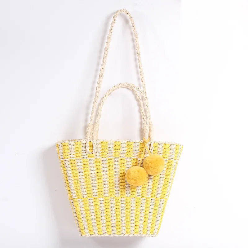Stay stylish on your seaside vacation with this hand-woven bag. Made from natural straw with wool ball details, this bag is perfect for the beach or a casual outing.