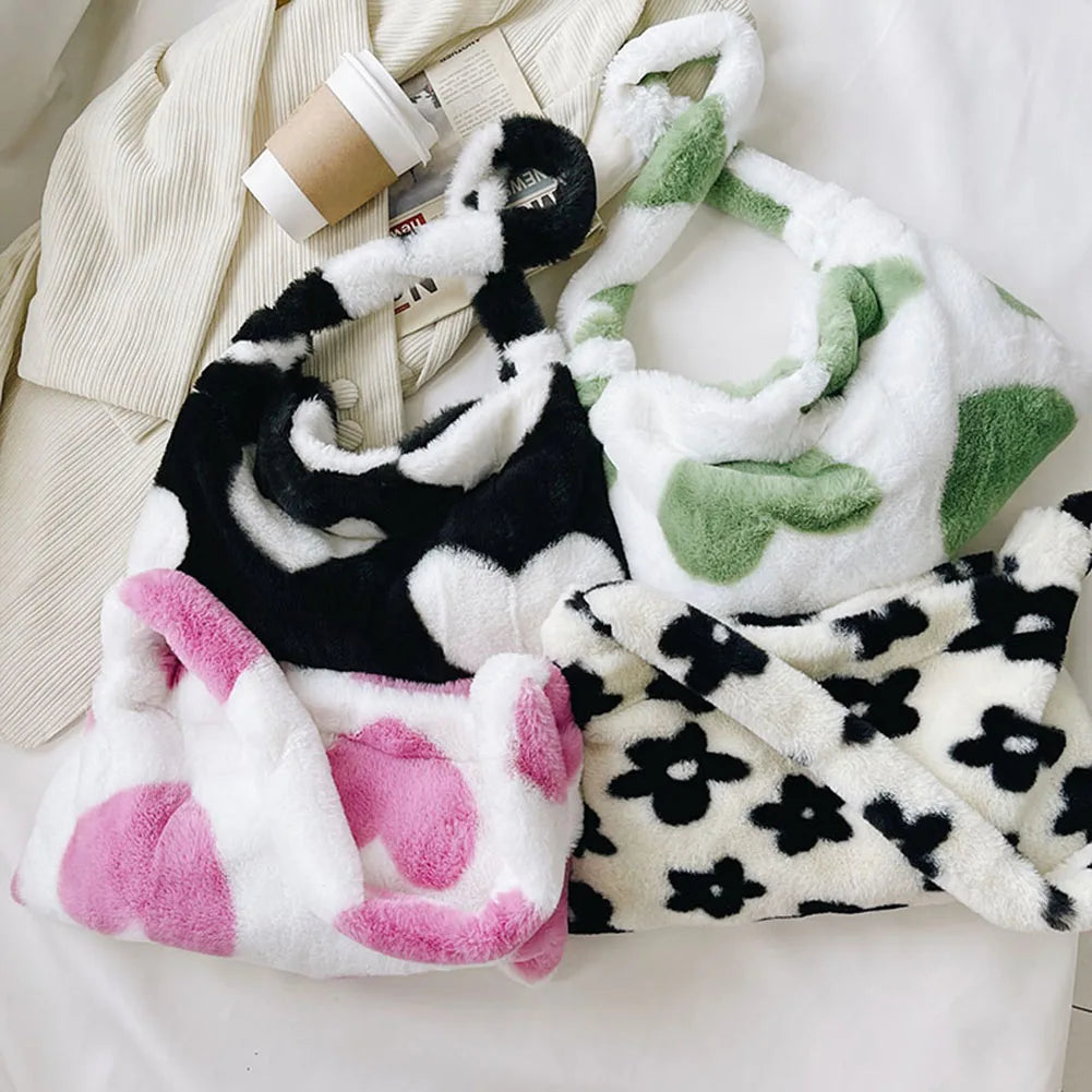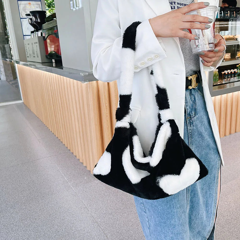 Heart Print Plush Shoulder Bag Women Casual Winter Hit Soft Small Shoulder Bags