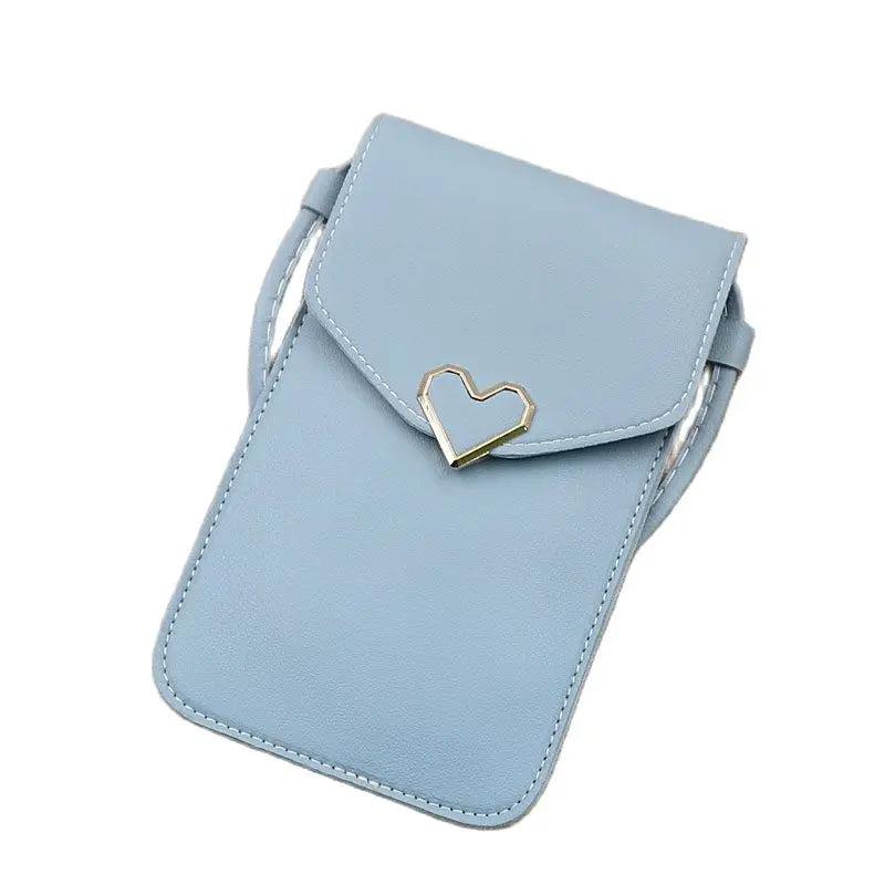 Transparent mobile phone bag with heart-shaped decoration, ideal for students and messengers.
