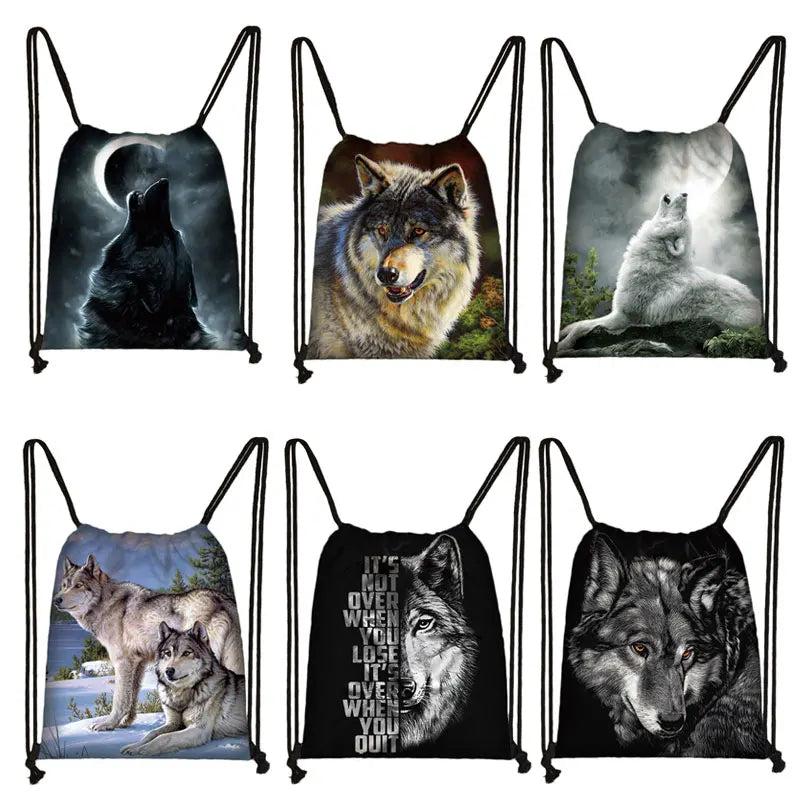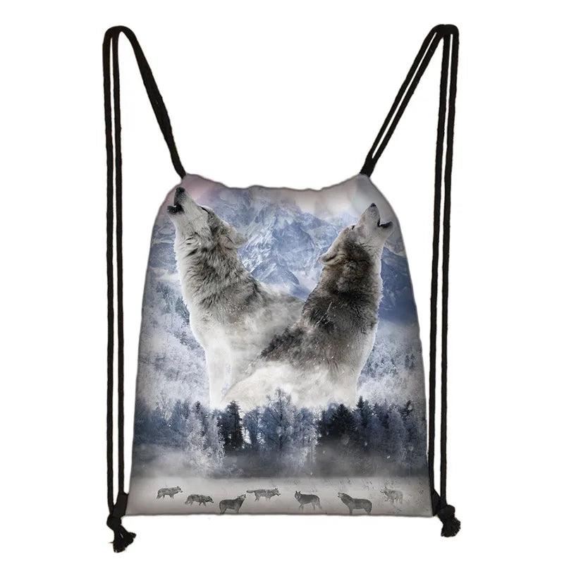This versatile backpack features a howling wolf design, perfect for travel, school, or everyday use. It has a drawstring closure and a separate shoe compartment.