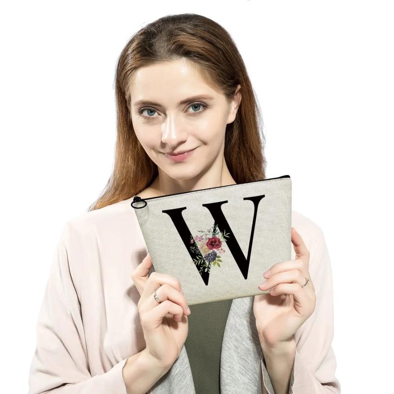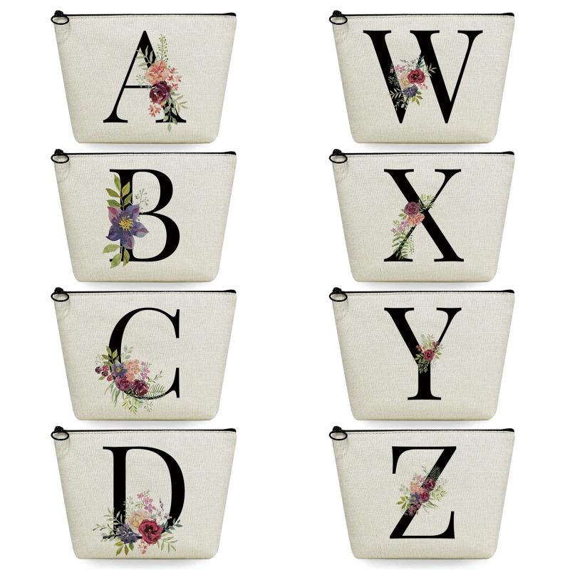 Keep your toiletries organized in style with this linen pouch featuring an initial letter and flower name design. Perfect for travel or as a teacher gift bag.