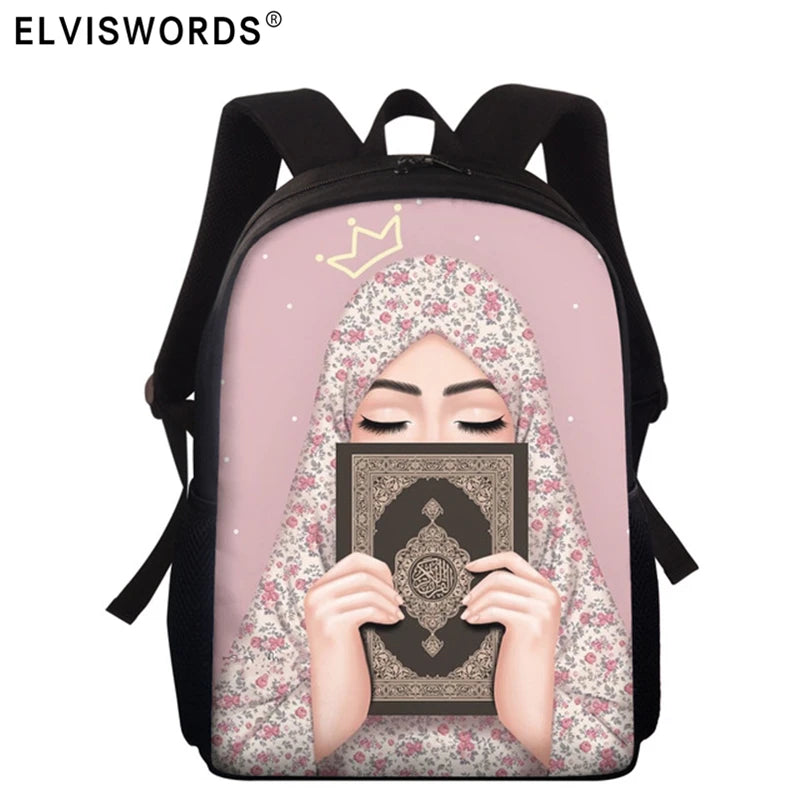 This elementary school bag features a hijab face Muslim Islamic girl design, perfect for girls, boys, and women. The vibrant printing adds a unique touch to the backpack.