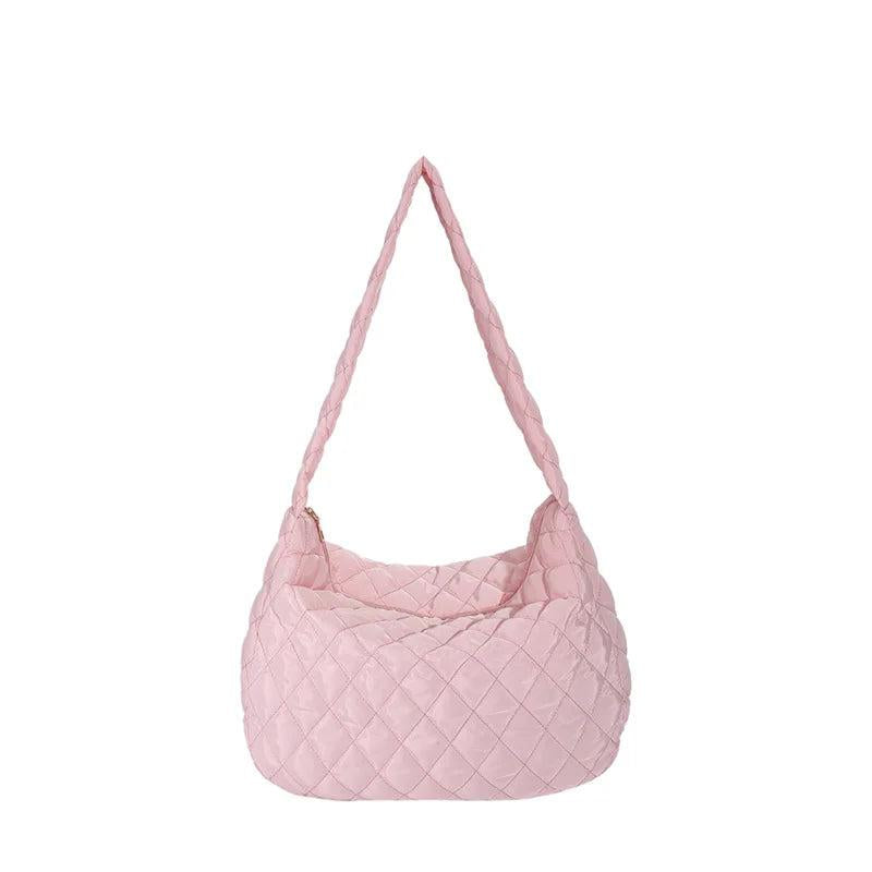 Stay stylish and cozy with this large quilted puff shoulder bag. Perfect for college girls and winter outings.