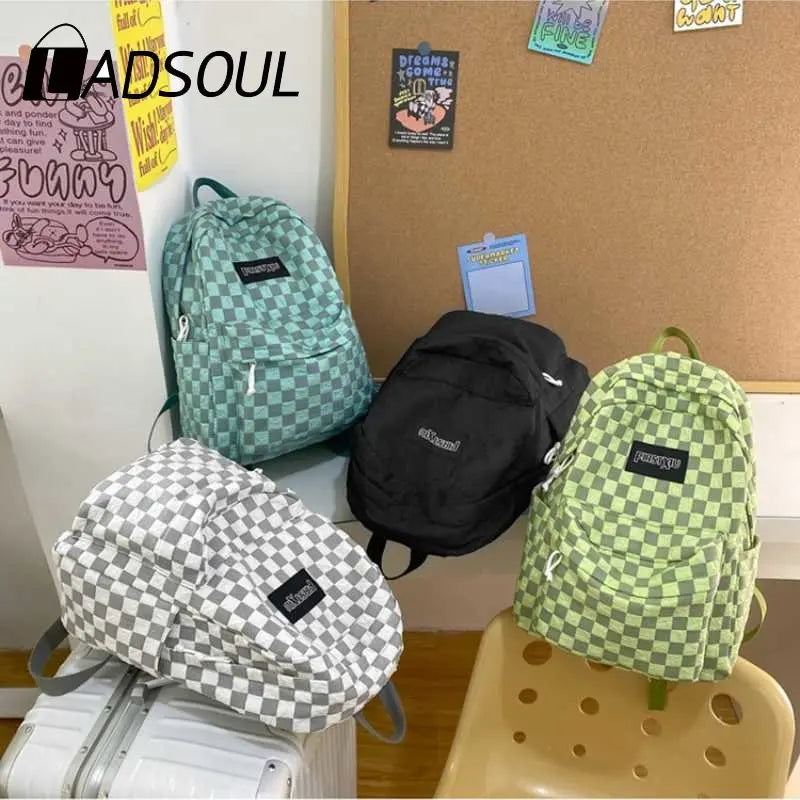 LADSOUL Women Nylon Backpack Student Checkerboard Schoolbag Female Casual