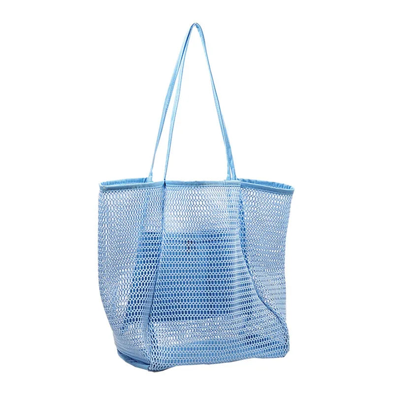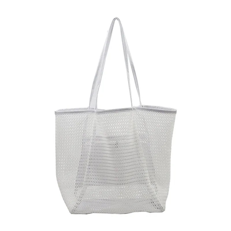 Stay prepared for a day at the beach with this stylish and spacious net shoulder bag. Perfect for carrying all your essentials like towels, sunscreen, snacks, and more.