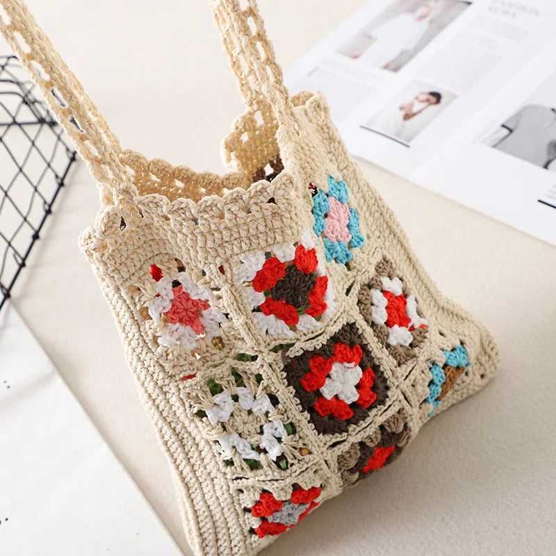 This crochet hand knit bag offers a stylish and spacious solution for carrying your essentials. Made with a unique plaid pattern in multiple colors, this bag is perfect for everyday use.