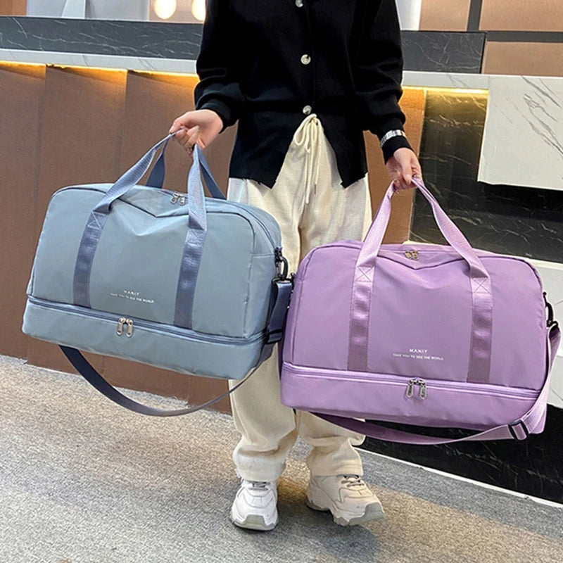 This travel bag is perfect for weekend getaways, featuring a spacious design with dry and wet separation compartments for convenience. It also includes a dedicated shoe compartment.