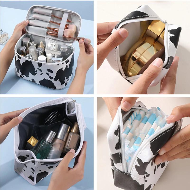 Stay organized on the go with this stylish and spacious travel cosmetics bag. Made of waterproof material with a cow pattern, this tote has a large capacity for all your beauty essentials.