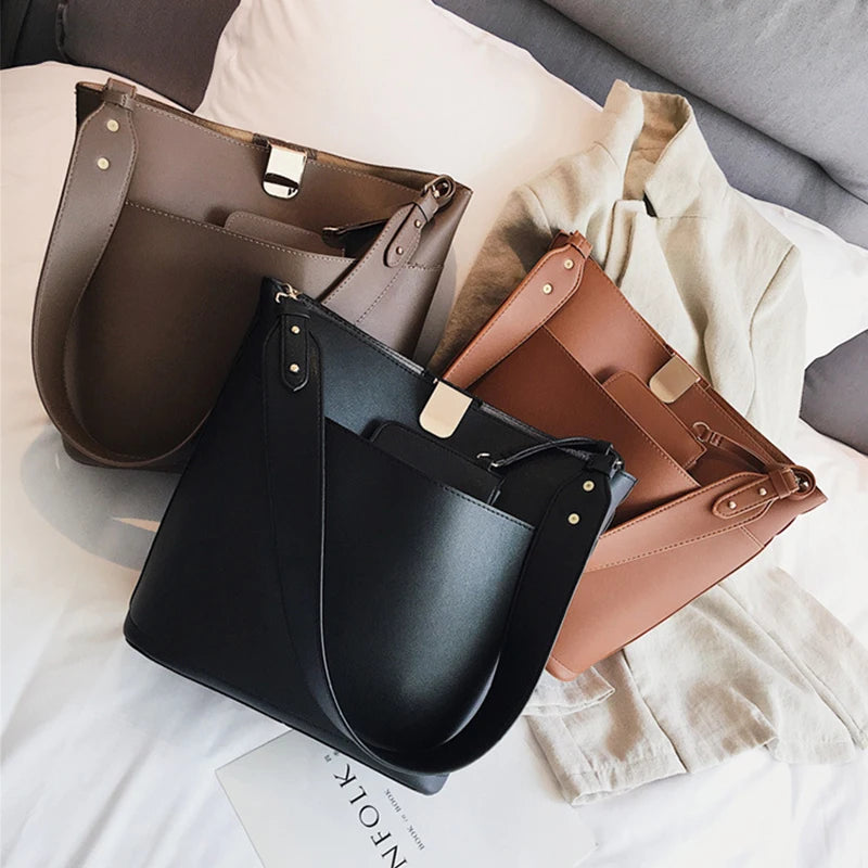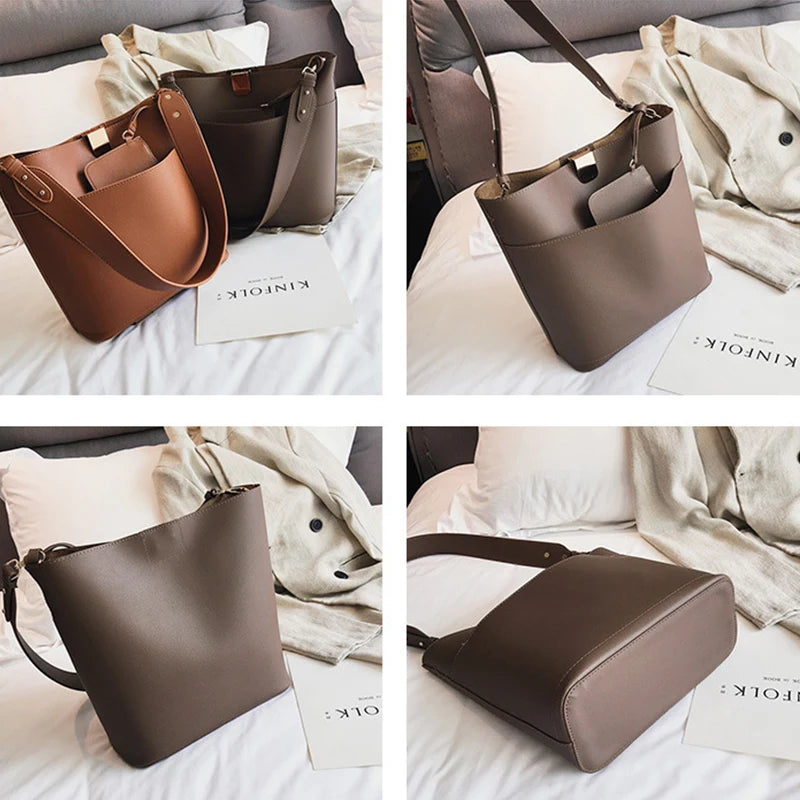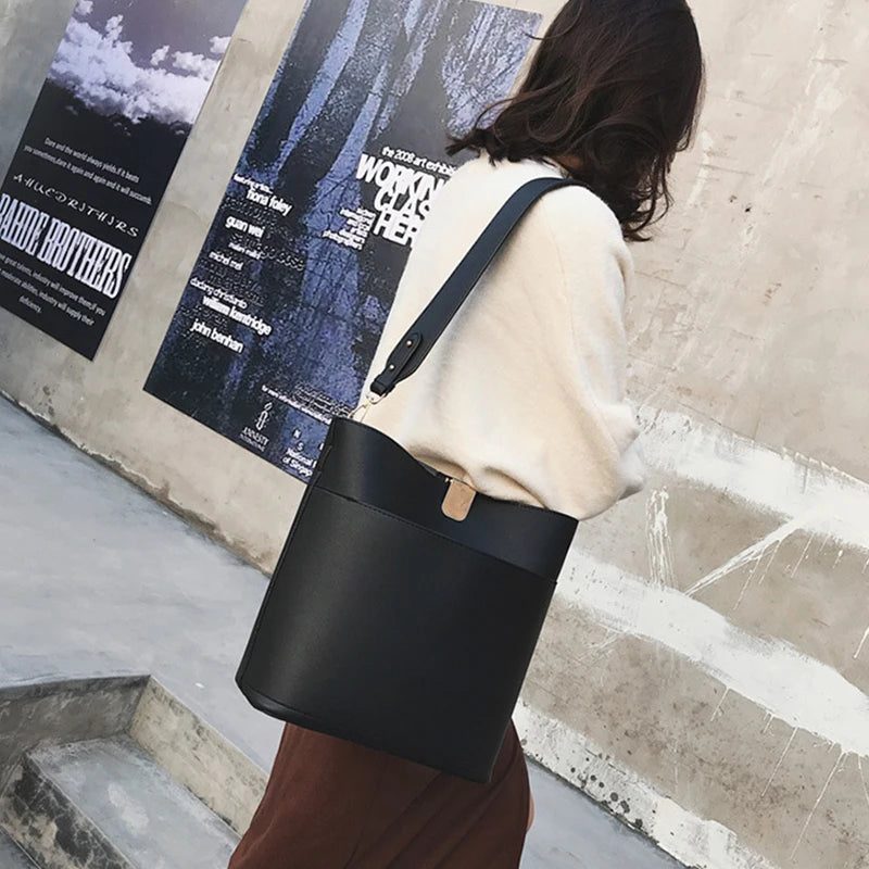 Large Capacity Women Bucket Bags PU Leather Shoulder Bags Solid Crossbody Bag