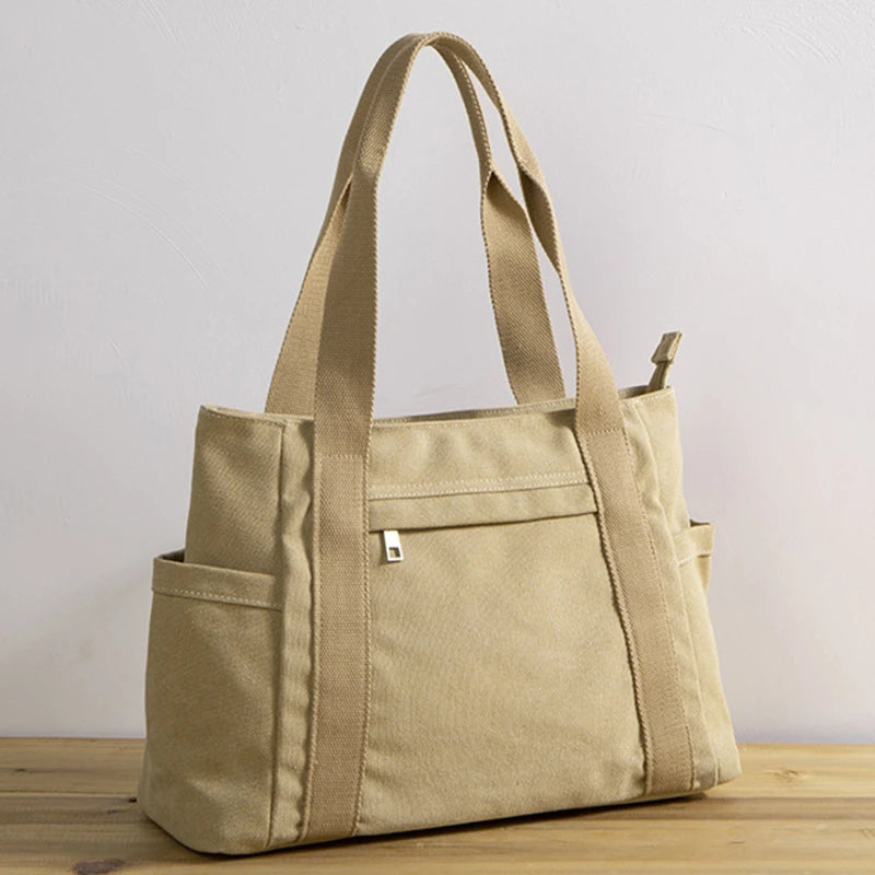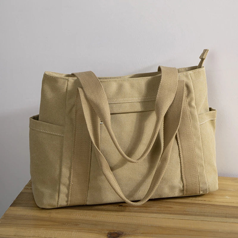 This A4 blank female shoulder canvas bag is perfect for women. It is made of high-quality fabric cloth and features a zipper closure.