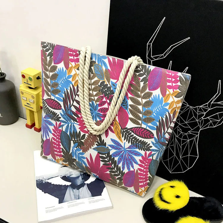 Leaf Printed Canvas Shoulder Bag Large Capacity Women Shopping Tote