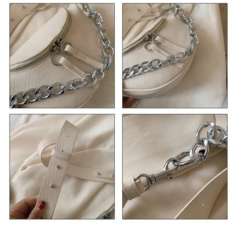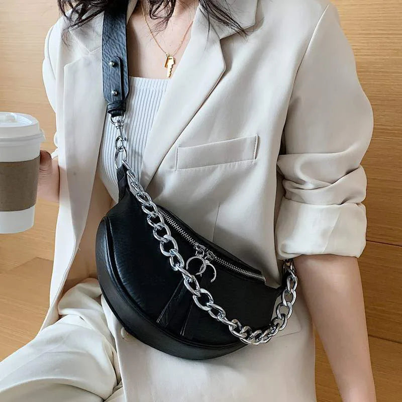 Stay stylish and hands-free with this designer leather women fanny pack featuring chains. Perfect for travel, school, or everyday use.