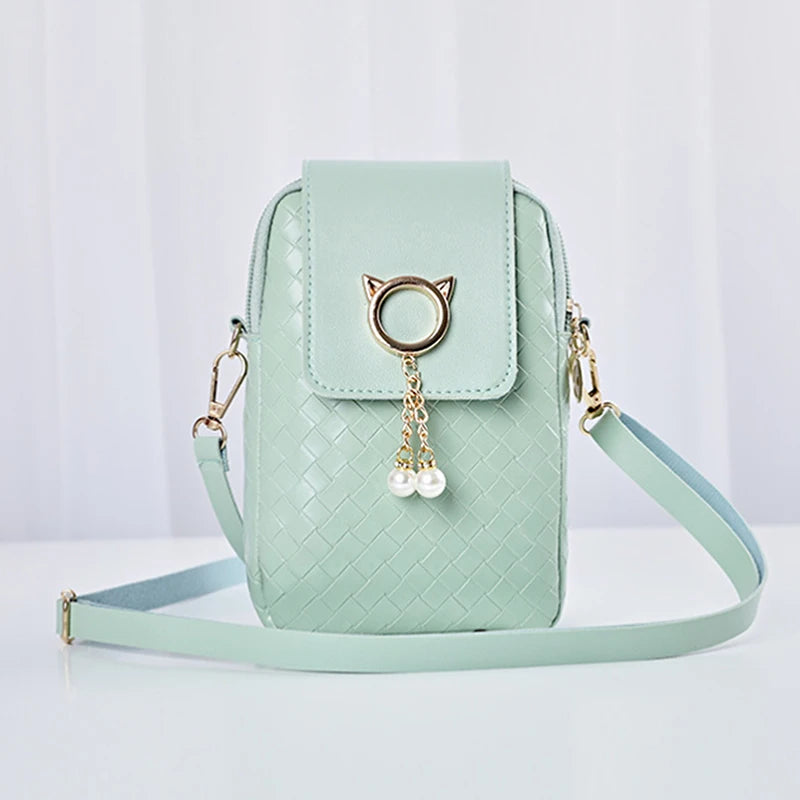 This mini cross-body shoulder bag is made of high-quality leather with a woven design and pearl tassel cover. It's the perfect accessory for women who are on the go and need to carry their phone in style.