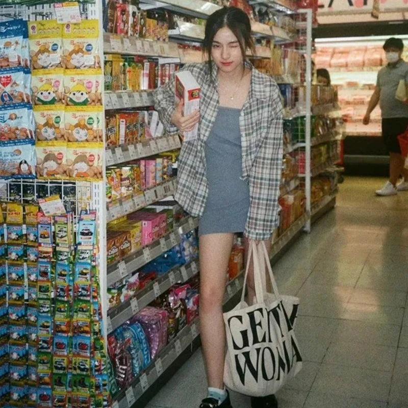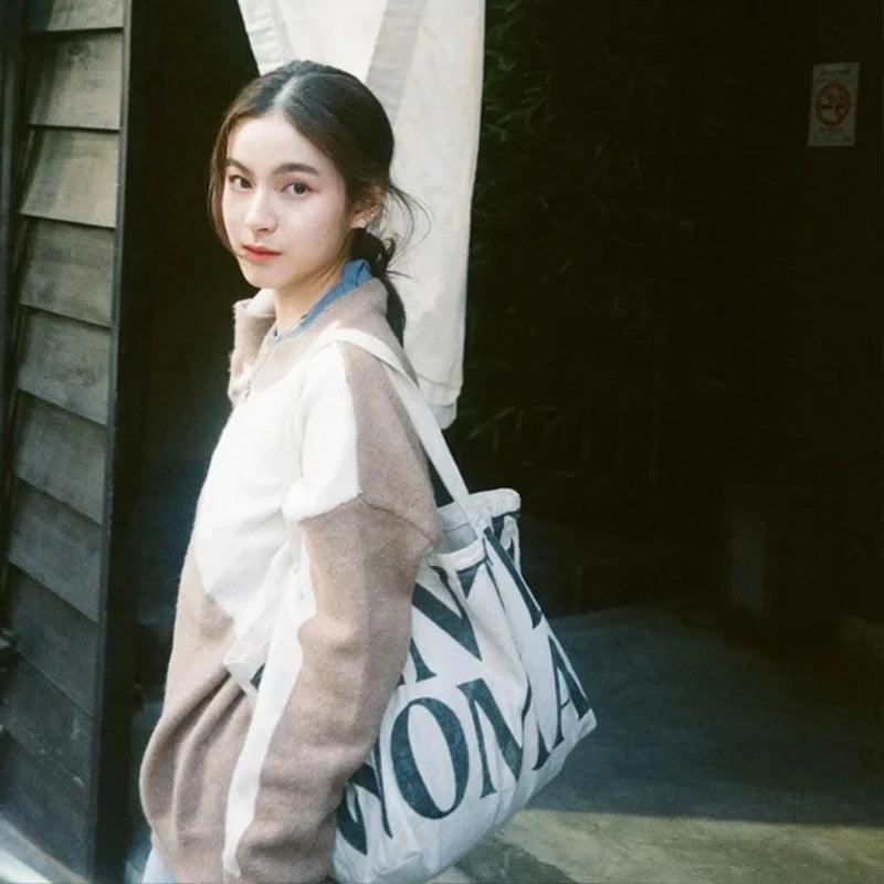 This stylish canvas bag is perfect for shopping or daily use. It features a letter design and offers a high capacity. The shoulder straps ensure comfort while carrying your essentials.