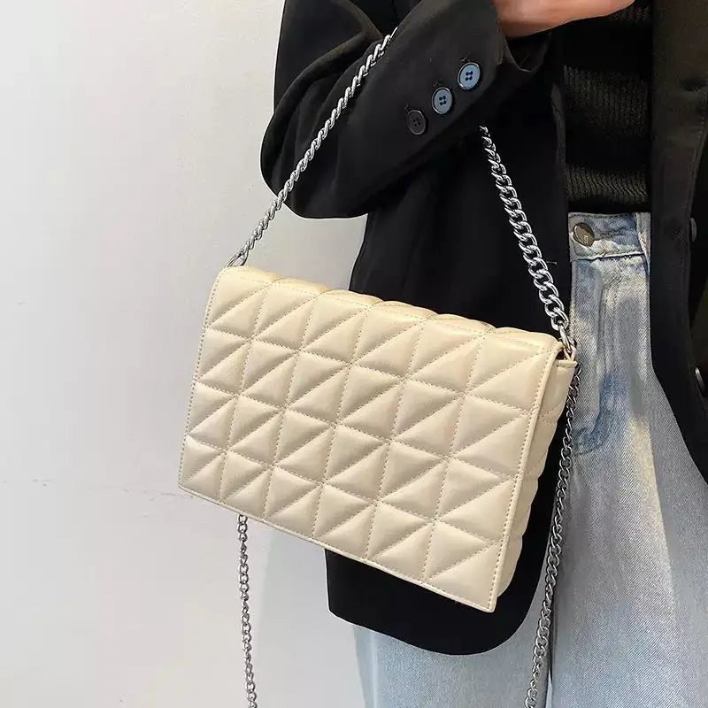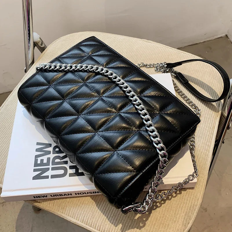 This fashionable shoulder bag features a quilted design with a stylish chain strap. Made of high-quality PU leather, it is perfect for everyday use.
